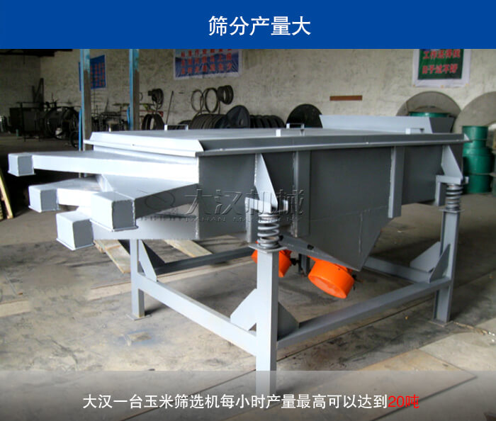 針對玉米篩選行業(yè)而言,對我們篩選機的產(chǎn)量是有要求的,大漢生產(chǎn)的玉米篩選機采用雙電機驅(qū)動,設備激振力大,而且我們的玉米篩選機加裝分料器,能有效的利用直線振動篩篩面面積,能使物料均勻分布在篩面上,大大提升物料篩分精度與蟬聯(lián),據(jù)實驗證明,大漢一臺玉米篩選機每小時產(chǎn)量高可以達到20噸。