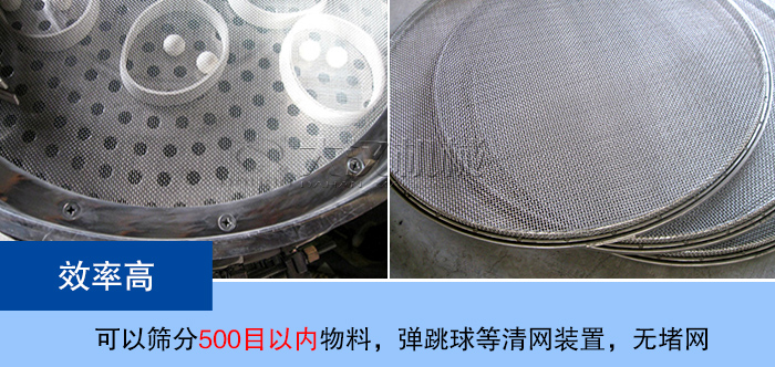 雙層旋振篩可以篩分500目以內(nèi)粉狀及顆粒狀物料,也可過濾5微米的漿液物料,篩分除雜效果好,,每小時可以處理1-5噸左右的物料,另外,我們的雙層旋振篩還加裝了彈跳球等清網(wǎng)裝置,設(shè)備無明顯的堵網(wǎng)現(xiàn)象,篩分效率高。