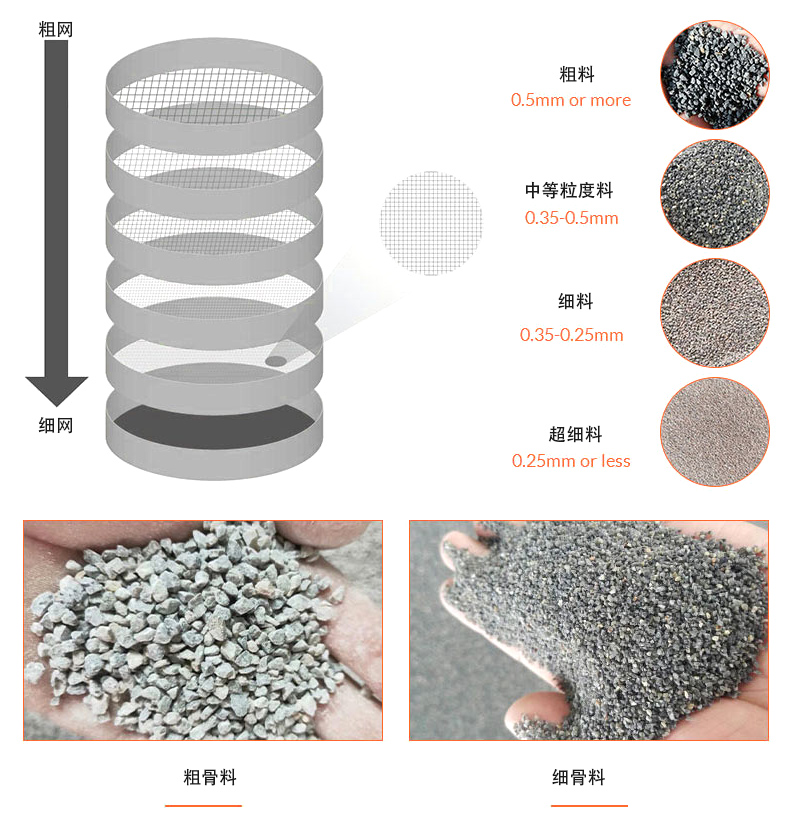 粒度分級(jí):根據(jù)篩孔或篩網(wǎng)的大小,物料會(huì)被分為不同的粒度級(jí)別。較細(xì)的顆粒會(huì)通過(guò)較小的篩孔,而較粗的顆粒會(huì)被擋在較大的篩孔上。