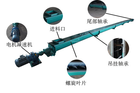 U型螺旋輸送機工作時,電機帶動旋轉(zhuǎn)的螺旋葉片將物料推移而進行輸送,螺旋輸送機旋轉(zhuǎn)軸上焊的螺旋葉片,葉片的面型根據(jù)輸送物料的不同有實體面型、帶式面型、葉片面型等型式