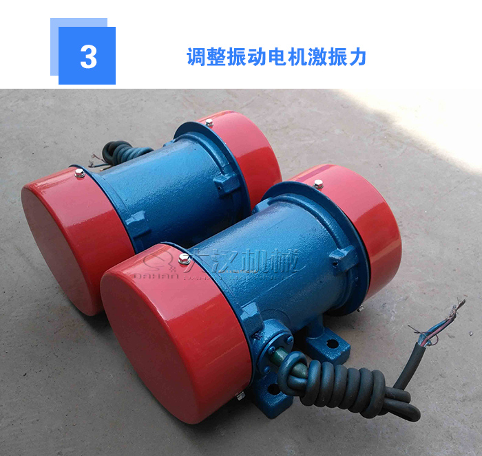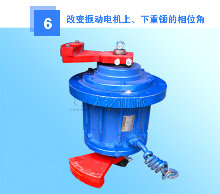 振動電機(jī)通過改變偏心塊夾角的大小來調(diào)節(jié)偏心塊,夾角越大激振力則越小,反之夾角越小激振力越大,兩塊偏心塊重合時激振力大。