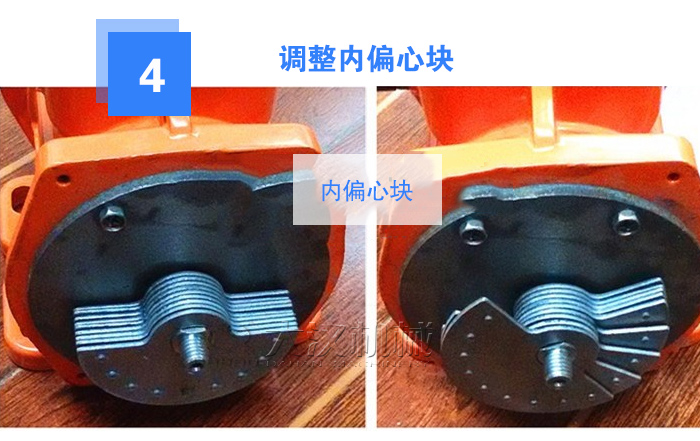 旋松兩側(cè)內(nèi)偏心塊壓緊螺栓,兩側(cè)內(nèi)偏心塊同向轉(zhuǎn)動,使內(nèi)偏心塊上的激振力標(biāo)尺刻線對準(zhǔn)外偏心塊上的開縫,調(diào)整所需激振力,擰緊內(nèi)偏心塊壓緊螺栓,裝上防護(hù)罩。