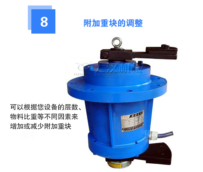 在上、下重錘的一側(cè)裝有附加重塊,它的作用是增減篩機(jī)的激振力。您可以根據(jù)您設(shè)備的層數(shù)、物料比重等不同因素來增加或減少附加重塊。