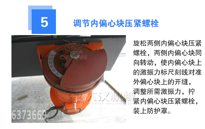 轉(zhuǎn)軸的兩端面上都刻有基準(zhǔn)線,旋松兩側(cè)外偏心塊壓緊螺栓,兩側(cè)外偏心塊同向轉(zhuǎn)動,使軸上刻線對準(zhǔn)外偏心塊上的激振力標(biāo)尺刻線,調(diào)整所需激振力,擰緊外偏心塊壓緊螺栓,裝上振動電機(jī)的防護(hù)罩就可以了。