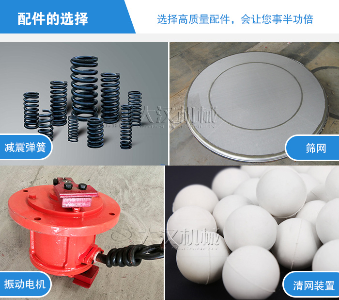 三次元旋振篩配件包括篩網(wǎng),振動(dòng)電機(jī),清網(wǎng)裝置,減震彈簧等,篩分物料和產(chǎn)量不同,選擇的篩網(wǎng),振動(dòng)電機(jī)以及清網(wǎng)裝置是不同的,距離來說,常見的清網(wǎng)裝置有彈跳球清網(wǎng)裝置、超聲波清網(wǎng)裝置,這兩者的選擇在于物料的難篩程度,針對(duì)高粘性,易于堵網(wǎng)的物料,大漢廠家還是建議您選擇超聲波清網(wǎng)裝置,清網(wǎng)效果會(huì)更好。