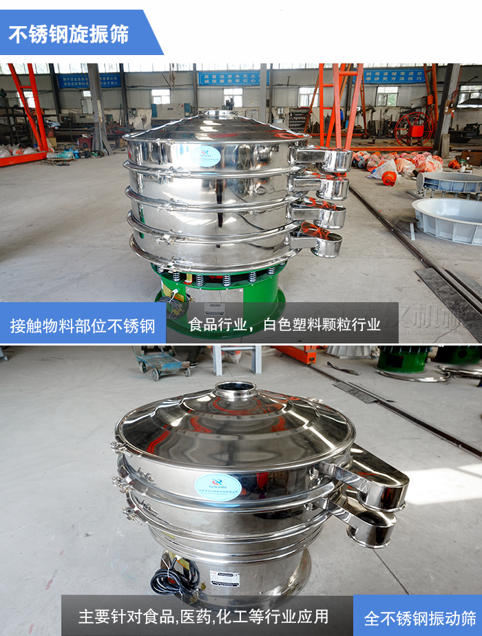 不銹鋼旋振篩的材質(zhì)樣式分為接觸物料部位為不銹鋼和全不銹鋼振動篩兩種。接觸物料為不銹鋼材質(zhì)的振動篩主要是物料對接觸的設(shè)備材質(zhì)有所要求,防止物料與碳鋼接觸對物料進(jìn)行污染,特別是食品行業(yè),白色塑料顆粒行業(yè)等。全不銹鋼振動篩是主要針對食品,醫(yī)藥,化工等行業(yè)應(yīng)用,其使用環(huán)境要求嚴(yán)格,容易對設(shè)備進(jìn)行清理。