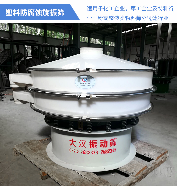 塑料防腐振動篩主要是為了解決篩分時特殊物料與金屬接觸而產(chǎn)生化學(xué)反應(yīng)及腐蝕性較強(qiáng)等問題。振動篩接觸物料部位從篩框、篩網(wǎng)、中框、密封蓋和清網(wǎng)裝置等完全采用非金屬材料,完全排除了一些特殊物料與金屬接觸會產(chǎn)生化學(xué)反應(yīng)等問題。本機(jī)適用于化工企業(yè),軍工企業(yè)及特種行業(yè)干粉或漿液類物料篩分過濾行業(yè)。