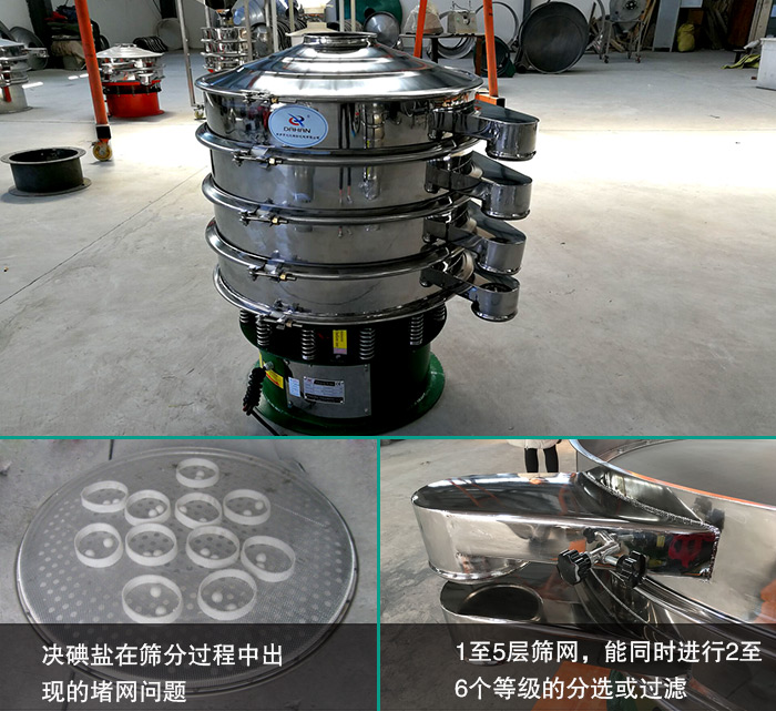 不銹鋼振動篩內(nèi)部裝配有彈跳球清網(wǎng)裝置,可以有效解決碘鹽在篩分過程中出現(xiàn)的堵網(wǎng)問題,提高了篩機的篩分效率。此外,不銹鋼振動篩可篩1至5層篩網(wǎng),能同時進行2至6個等級的分選或過濾,篩分更加高效。 干凈衛(wèi)生