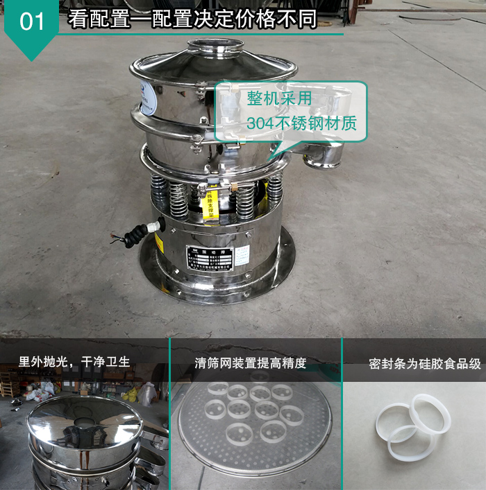 全不銹鋼振動篩整機(jī)采用304不銹鋼材質(zhì),里外拋光,干凈衛(wèi)生,無毛刺,無死角,密封條為硅膠食品,彈簧外圍加304不銹鋼裙邊,同時還配備有專門的篩網(wǎng)清理裝置,可將堵網(wǎng)率降到低,過網(wǎng)率和處理精度得以有效提高。 看型號—型號決定價格不同