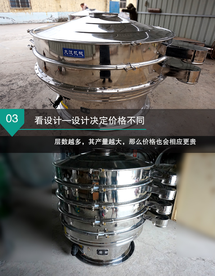 由于全不銹鋼振動篩生產(chǎn)廠家眾多,這里就簡單以新鄉(xiāng)大漢振動機(jī)械有限公司為例,大漢全不銹鋼振動篩的價格普遍在5000-30000元之間。 看配置—配置決定價格不同